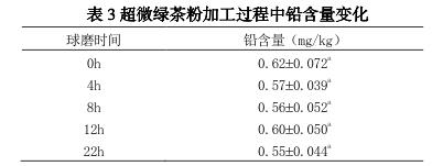 超微綠茶粉中的鉛并無顯著差異。原因?yàn)樵谇蚰ゼ庸み^程中,茶樣處于密閉空間中,且所接觸的球磨材料中鉛,所以在超微綠茶粉的加工過程中,并不會造成鉛污染。