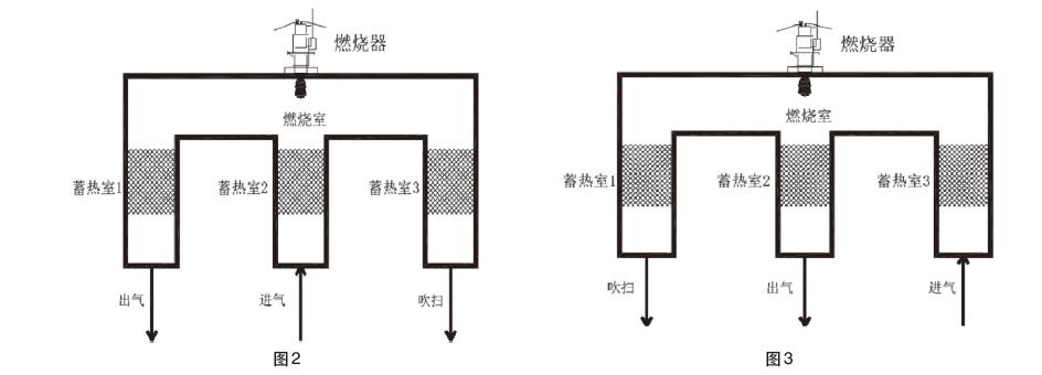待蓄熱室3里面蓄熱體熱量吸附飽和后,切換閥進(jìn)行切換,如圖2所示。廢氣進(jìn)入蓄熱室3,經(jīng)過(guò)高溫預(yù)熱后,進(jìn)入燃燒室,從蓄熱室2出,熱量為蓄熱室2所吸收,直至蓄熱室2吸附飽和,開始切換。如圖3所示進(jìn)入下一個(gè)流程,3次切換為一個(gè),如此運(yùn)行。RTO切換閥切換時(shí)間,一般為60s-120s,切